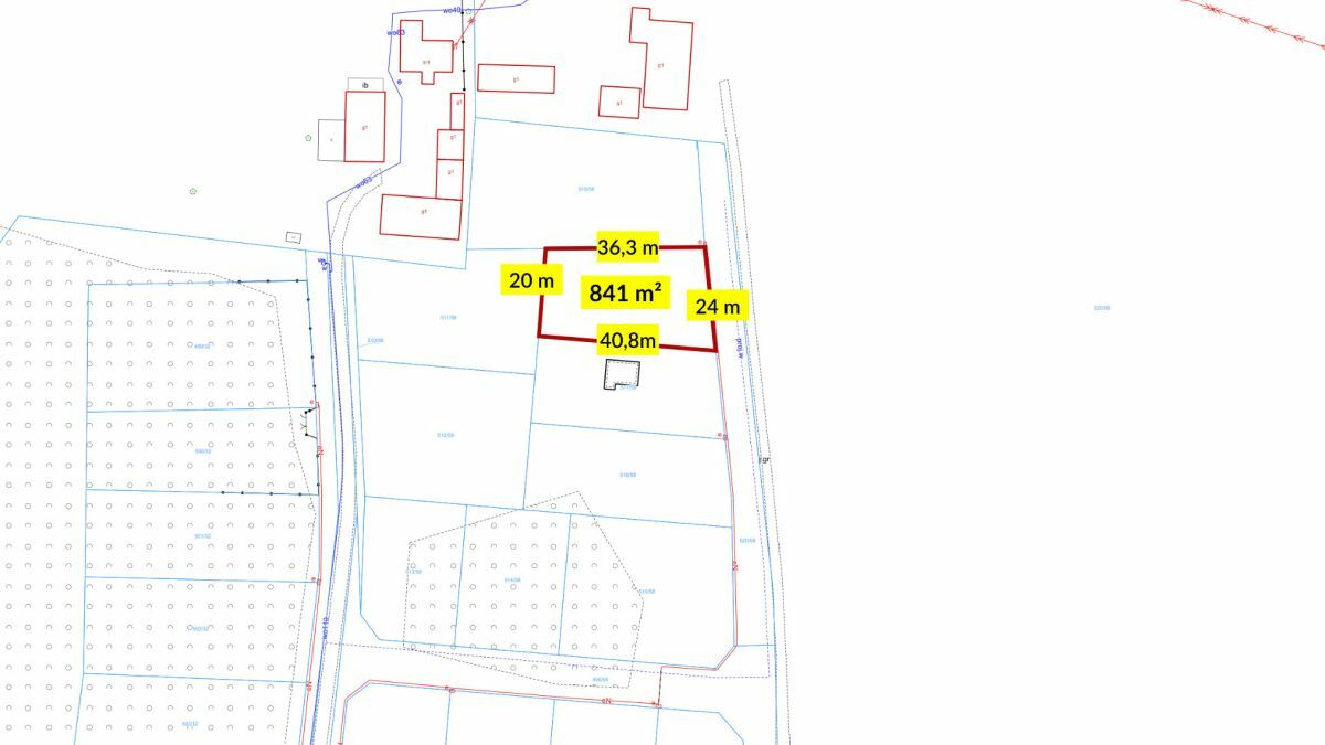 Wymiary: Front ok. 20 m, boki: 40,8 m / 36,3 m, tył: 24 m.